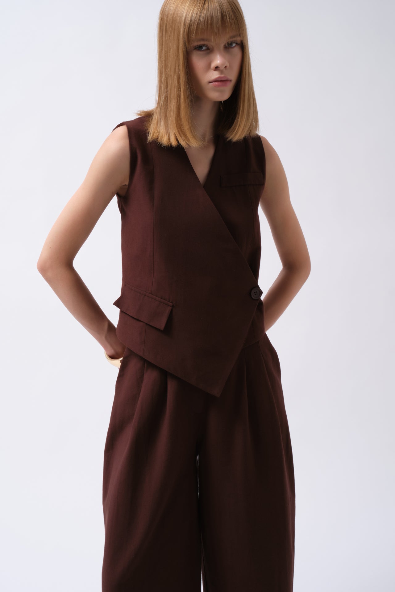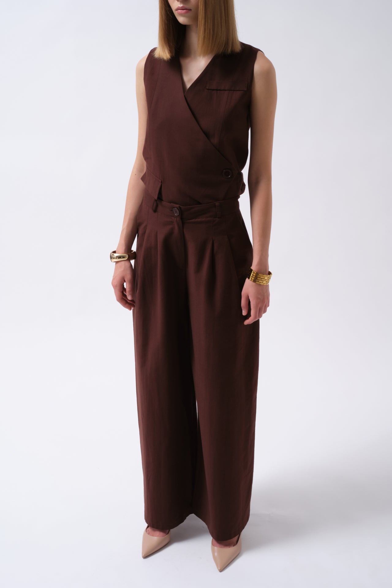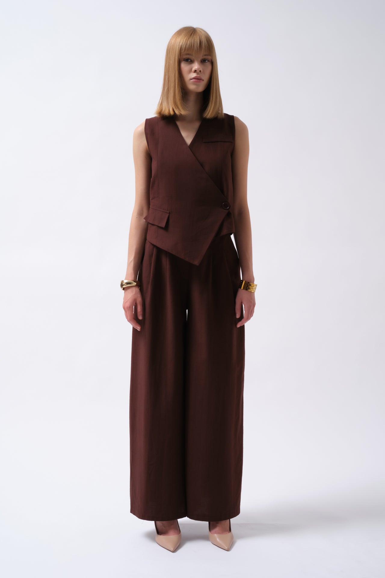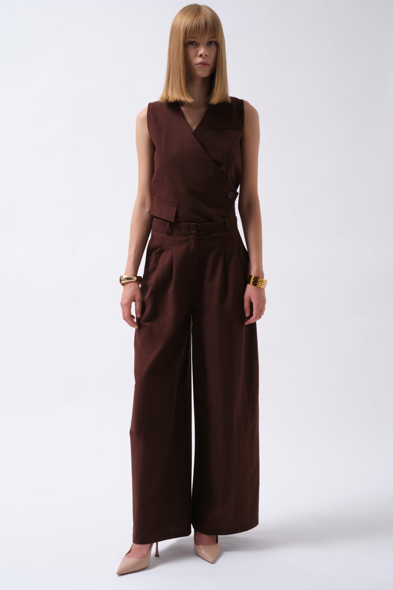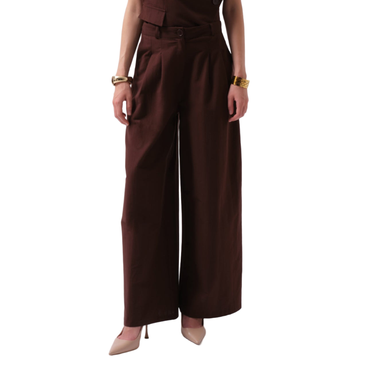 Ένα κομψό και άνετο palazzo παντελόνι σε ζεστό καφέ τόνο, ιδανικό για καθημερινές αλλά και πιο προσεγμένες εμφανίσεις. Η αέρινη γραμμή του χαρίζει κίνηση, ενώ το κουμπωτό κλείσιμο στη μέση προσφέρει σταθερή εφαρμογή και διαχρονικό στυλ.