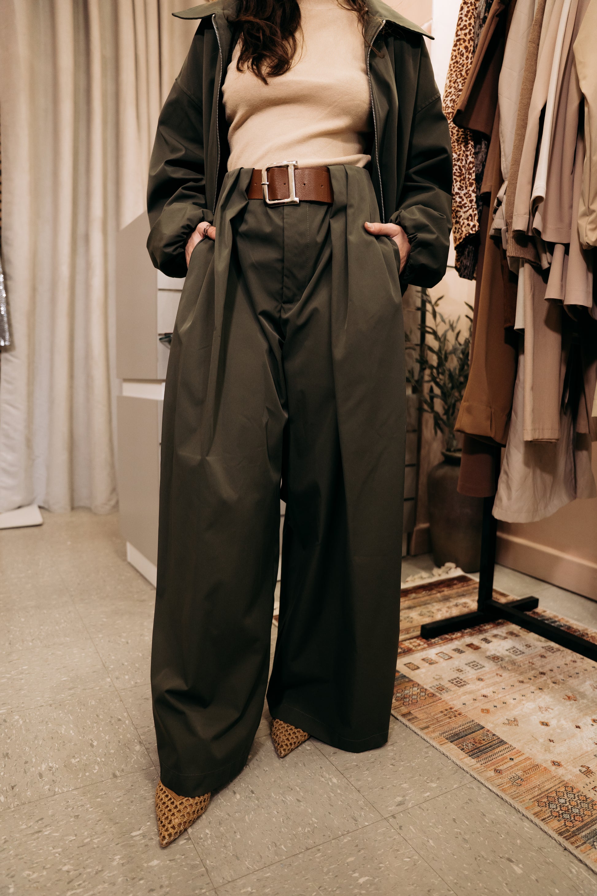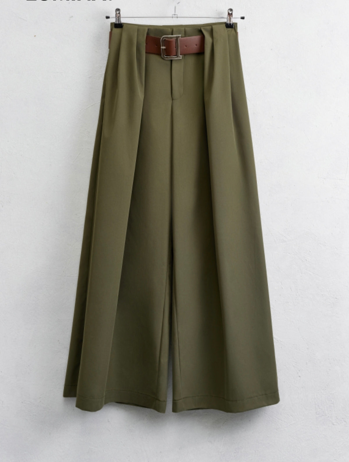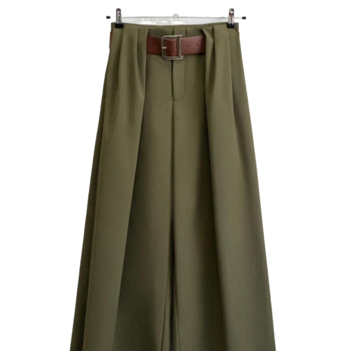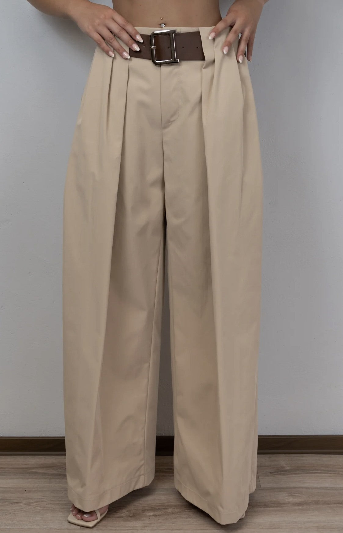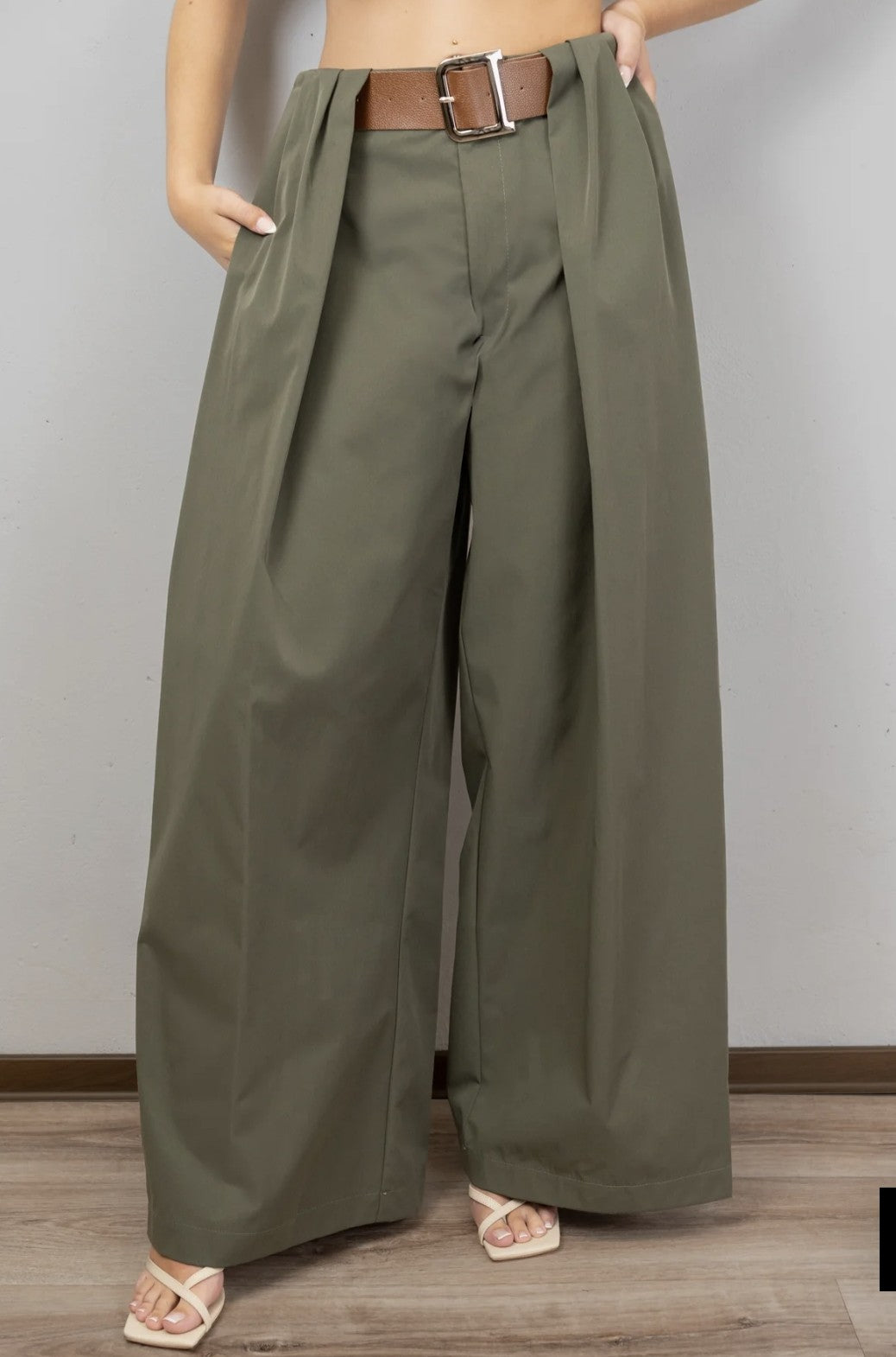 Αναβαθμίστε το καθημερινό σας στιλ με αυτό το elegant παντελόνι palazzo σε χακί και μπέζ απόχρωση, σχεδιασμένο για άνεση και σύγχρονη αισθητική. Η ψηλή μέση του προσφέρει κολακευτική εφαρμογή και τονίζει τη σιλουέτα, ενώ οι διακριτικές πιέτες στο μπροστινό μέρος δημιουργούν μια κομψή, ρευστή γραμμή. Συνοδεύεται από καφέ ζώνη που προσθέτει μια refined λεπτομέρεια και διευκολύνει τη ρύθμιση της εφαρμογής. Το σταθερό αλλά άνετο ύφασμα το καθιστά ιδανικό για office looks, αλλά και για καθημερινές chic εμφανίσεις.
