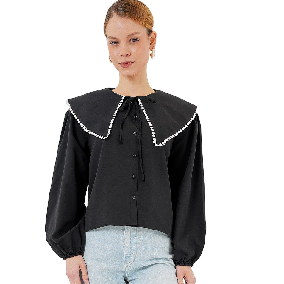 Ένα κομψό και ξεχωριστό κομμάτι που δίνει χαρακτήρα σε κάθε εμφάνιση. Το μαύρο πουκάμισο με εντυπωσιακό γιακά και λευκή διακοσμητική τρέσα συνδυάζει κλασική αισθητική με μια μοντέρνα πινελιά. Το ελαφρύ ύφασμα προσφέρει άνεση, ενώ η χαλαρή γραμμή και τα balloon μανίκια χαρίζουν αέρα κομψότητας και θηλυκότητας. Ιδανικό για chic καθημερινά looks αλλά και πιο προσεγμένες εμφανίσεις.
