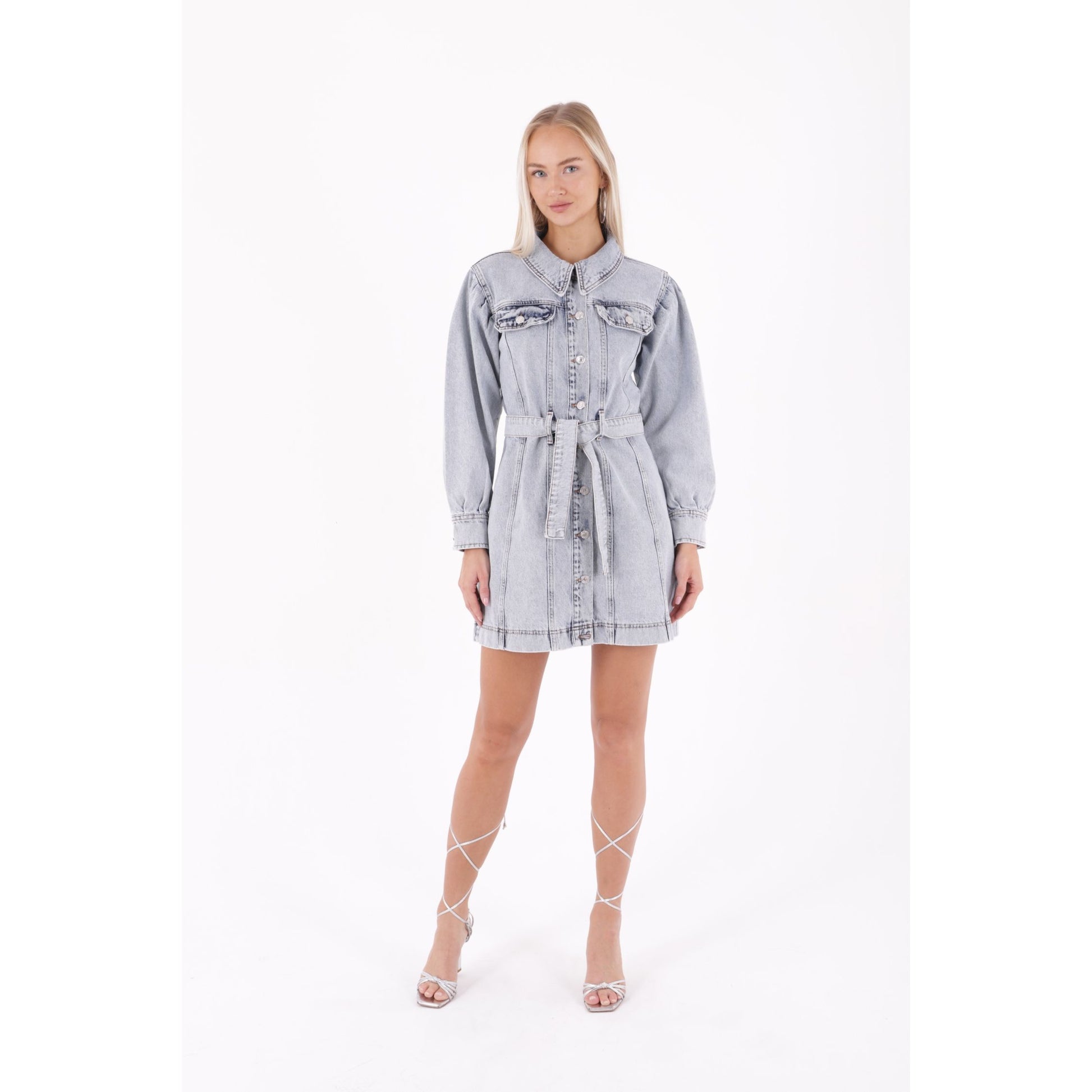 Φόρεμα τζιν με κουμπιά και μπαλονέ μανίκια – Ανοιχτό γκρί